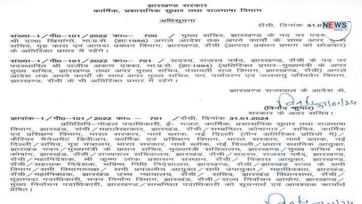Jharkhand news: Senior IAS officer Avinash Kumar was removed as the Additional Chief Secretary of the Home Department of the Jharkhand government on today (January 31), a statement said.
