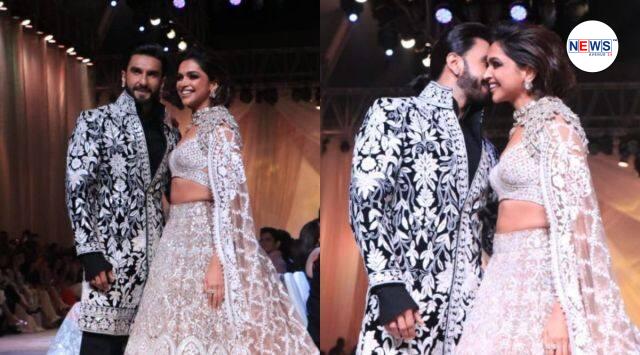 Ranveer Singh took a dramatic pause at Manish Malhotra’s show to plant a kiss on his actor-wife Deepika Padukone’s cheek.