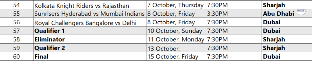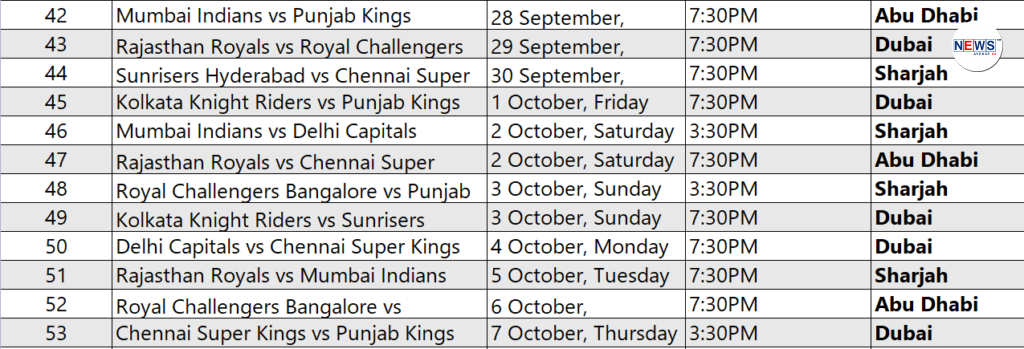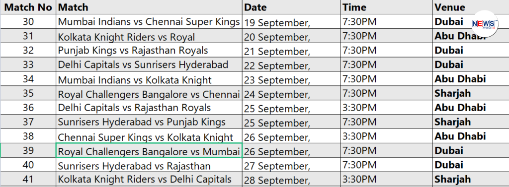 The action will then shift to Abu Dhabi where the Kolkata Knight Riders will square off against Royal Challengers Bangalore. Sharjah will host its first game on September 24 when Royal Challengers Bangalore take on Chennai Super Kings. In all, 13 matches will be held in Dubai, 10 in Sharjah, and 8 in Abu Dhabi.